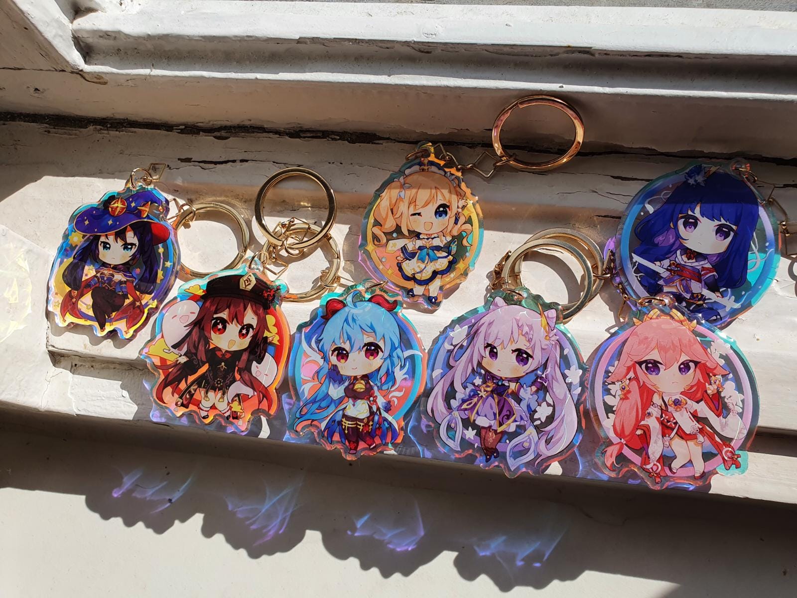Diese sind auf buntem Regenbogen-Acryl gedruckt, das je nach Lichteinfall seine Farbe ändert. Sie sind etwas über 6cm groß und mit einem Metall-Schlüsselanhänger versehen. Die Vorderseite ist mit Epoxidharz überzogen und die Rückseite weist eine leicht abgewandelte Version auf!